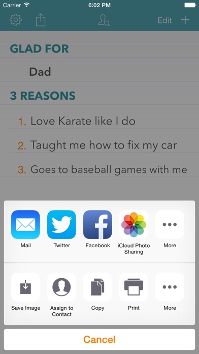 When is the last time you expressed your appreciation for someone special in your life? Take a minute to think of a moment when you were truly happy. Who made that moment so special? Let them know! Introducing 3 Reasons for iOS, a sister app to Wants & Thanks. 3 Reasons is a simple and elegant way to express gratitude for the people and things in your life. Enter the name of someone or something you're grateful for and up to 3 reasons you appreciate them. Keep it private or send your list to that person as an image, text, or PDF. Sharing options include social media like twitter and Facebook, email, and text. Glad For • Name a person that you are Glad For • Name items that you are Glad For • List up to 3 reasons why you are glad for that person Features • Reorder numbered reasons by long press • Share to Social Media or by email • Export to PDF • Print • iCloud Sync I am Glad For (examples): • Dad • Mom • Wife • Relatives • Friends • John, Linda... • What I have • Doctors • Health • Talent • iPad, iPhone • Technology • App that you like • Podcast • Life • Sports • Gratitude • God, Religion • Items that make our life easier • Anything...