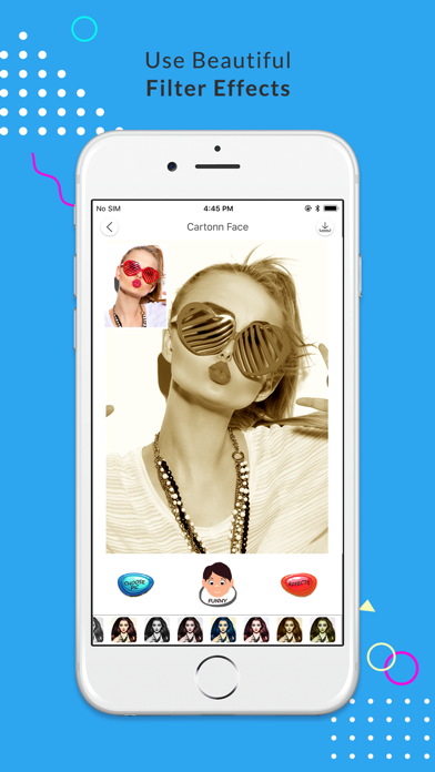 Bring a smile into your friends’ everyday life thanks to this hilarious face Cartoons. Take a photo of your gallery or one you choose from camera and distort, stretch ,bump etc. a face as you like. Transform your friends in some sort of crazy monsters by displacing and deforming completely some part of their faces. Take some pictures of your colleagues at work / school, at your sport club, from your class mates, etc. and create some comic caricatures of them to share a big smile with them. How will they look like? Will they appear fatter, thinner, whimsical, like an alien, funny, or maybe slightly scary? Find it out, with this amazing optionsl! With this fantastic tool you will be able to create fake pictures to send per mail, share with, Twitter, another Messenger simply upload them to Facebook etc. Features: - Choose a picture from gallery or snap via camera - Choose funny button (Select the cartoons type) - For best performance choose or capture an image with face.