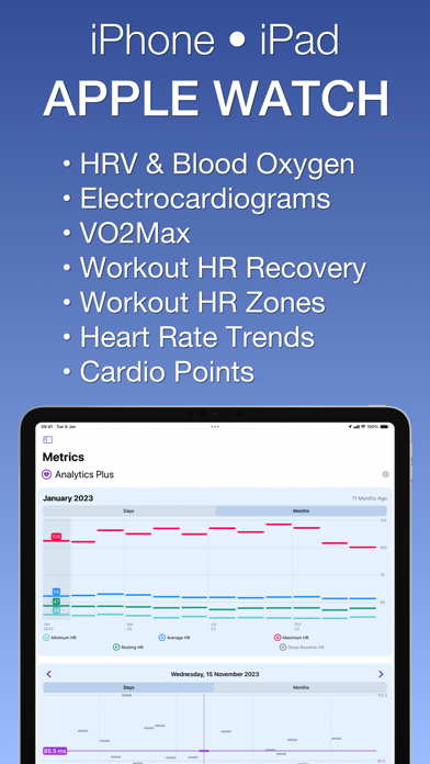Heart Analyzer offers users the ultimate insight into their Health data. Utilising the rich data recorded by Apple Watch, Heart Analyzer gives you a powerful understanding of your heart vitals. ------------------------------------------------ ■ Simple PRIVACY ------------------------------------------------ ◎ No third party analytics ◎ No data ever leaves your device ◎ No modifications to your health data ------------------------------------------------ ■ FEATURES ------------------------------------------------ ◎ The Dashboard - Where you can swipe between days, scroll through summaries and tap into the details ◎ Charts - Heart Rate data and many other metrics and trends of any given day ◎ Insights - Effortlessly assess your Health Vital trends ◎ Deep Analytics - Gain a unique understanding of important metrics such as HR Recovery, HR Zones and plenty more ◎ Heart Reports - Generate and export tailored PDFs including a large selection of metrics with custom timescales and password protection support ◎ Widgets - Right on your home screen for you to track your Heart Rate, Resting Heart Rate trends and more at a glance ◎ ECGs - Compare and analyze data recorded by Apple Watch ◎ Advanced features - Including Heart Rate Calibration, Heart Rate Zones, Smart Heart Rate Recovery and more ------------------------------------------------ ■ APPLE WATCH ------------------------------------------------ ◎ A re-designed app showing your Heart Rate over the day ◎ Charts with you on the go for Move, Exercise, Cardio Points, HRV, Blood Oxygen Saturation and Resting Heart Rate ◎ Workouts right on your wrist, tap into the detail as soon as you finish your exercise ◎ Customizable complications to keep you up to date with your Heart Rate and also support for Blood Oxygen Saturation, Heart Rate Variability and Resting Heart Rate trends HEALTH SUPPORT INCLUDES: • Heart Rate • Resting Heart Rate • Blood Pressure (Systolic & Diastolic) • Electrocardiogram (ECG/EKG) • Blood Oxygen Saturation (SPO2) • Cardio Fitness (VO2Max) • Heart Rate Variability (HRV) • Respiratory Rate • Workouts • Sleep Times • Heart Rate Recovery • Apple Fitness & Activity • Heart Alert Notifications Heart Analyzer has three Premium purchases or combine them all with the Complete Premium purchase. Heart Analyzer does not contain any subscriptions! Please Note: • Heart Analyzer integrates with the Apple Health App to read your Heart Rate and other Health data • Heart Analyzer is available on iPad with iCloud sync for Apple Health data enabled. However, you still need an iPhone with a paired Apple Watch to generate Health data to display in Heart Analyzer • To get the most out of Heart Analyzer, and iPhone with a paired Apple Watch is required