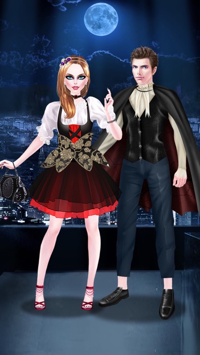 The local vampire Queen is holding a big ball for all of her subjects tonight! You received your invitation right as the sun went down, so you need to hurry and get ready. The Queen of the Night doesn’t like her guests to be late or a hot mess! Head straight to Midnight Salon to get the perfect look. Don’t forget to grab a hot date! In Vampire Salon, get ready to party with all the local monsters of the night. Relax in the spa to get your skin pampered and prepared for makeup. Design your look by selecting dark makeup that highlights the paleness of your skin. Fix your hair in beautiful curls or a gorgeous updo for an old-school look to match your age. Finally, dress in a beautiful gown that will impress your date. Once you’re ready, make sure your date is tall, dark, and handsome. A lady of the night can’t have a lame date! Product Features: - Cool vampire themed beauty salon game. - Choose a blood-thirsty monster: Serena, Cece, Monica, or Emmy. - Choose a date: Teddy, Richard, Robert, or Victor. - Spa tools to pamper your pale skin. - Beautiful dark makeups for the perfect midnight look. - Tons of gorgeous gowns to dress up in! - Makeover your date to match your look! - Find the hottest look for the vampire ball! How to Play: - Use interactive controls to play the game. - Pick a character to play. - Clean up, pick out makeup, and fix your hairstyle. - Dress in beautiful ball gowns. - Choose and dress up your date.