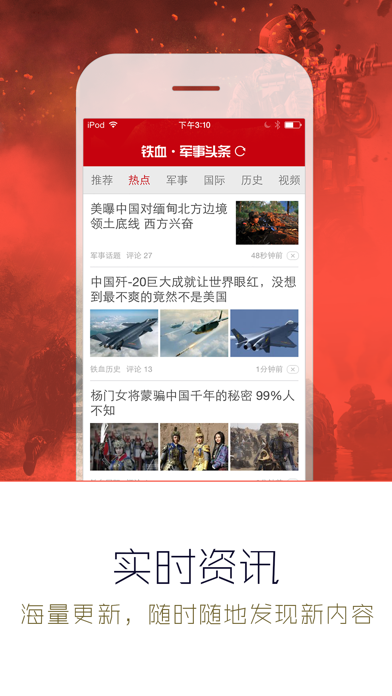 看军事,就得上军事头条 智能推荐:BAYMAX个性化订阅引擎为你量身打造的军事内容聚合平台。 实时资讯:随时随地发现新内容,为你带来全方位的军事新闻,军情动态。 深度专业:专家实时解读,军事内容更专业,全球军情动态一手掌握。 话题社区:最大的军事爱好者社区,资深军迷的聚集地。 一键分享:军事新闻一键分享到微博、微信、qq空间等社交平台。 千万军迷朋友的兴趣所在之处,铁血网荣誉出品。 如果遇到闪退问题,或者对产品有想法或建议,期待您及时反馈给我们: 客服QQ:2384096998 QQ群1:285484278 QQ群2:579185009