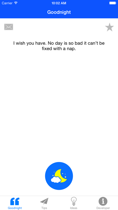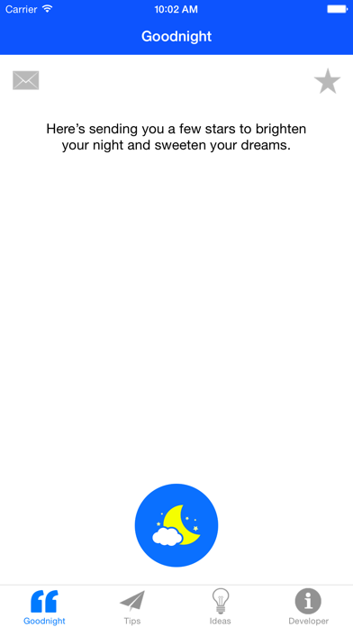 The largest collection of good night messages is here, now! You can always have in your pocket (and on your wrist, in case you have the Apple Watch) Hundreds and hundreds of romantic (and non-romantic) ways to say goodnight. Simply click on the circle with the moon, and you'll be able to generate a new message and send it to whoever you want! Great, isn't it? You will also have the opportunity to install the widget to always have a new message in the notification center every day! All messages have been found online and you can suggest new ones within the app.