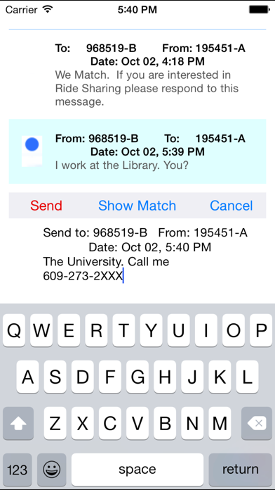 "CarPooling - Princeton Ride Share" connects users with matching carpooling needs in the Princeton, NJ area. Enter your your travel details (home location, work location, travel days and times and whether or not you have a car) and the app matches your travel details with other users. Matches are displayed on a map and ordered based on the separation of home locations. Overlapping days/times are indicated in a red/green graphic. A messaging system allows you to send and receive messages to and from your matches. Messaging is done anonymously until you chose to reveal your identity to a match. Flexible - can be used for daily 9-5 commuting, for off-hours commuting or for weekly scheduled activities. Enter information on up to 5 rides. Receive a notification whenever someone messages you. Uses Apple's iCloud CloudKit database; all information is transmitted and stored anonymously. Screenshots: 1) Matches around 'Home' location. Green areas on graphic indicate matches. 2) Matches around 'Work" location. 3) Match information on #2 identified by an anonymous ID#. 4) Messages received from other users of the app. 5) Sending a message giving contact information.