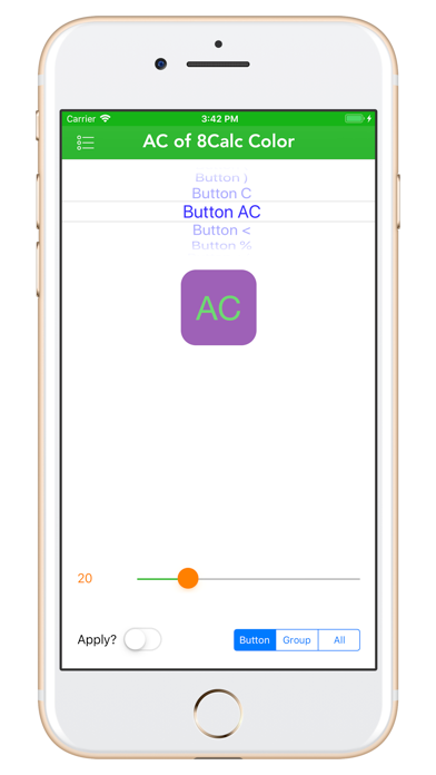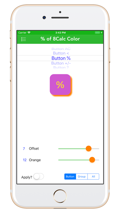 8Calc is an integral part of the 8Apps suite based on the same 'elegant simplicity' design framework. All 8Apps are high-quality software and reasonably priced (free :). Enjoy! 8Calc 'philosophy' is that the user knows best how they like to see their calculator and numbers! No more 3rd party themes (mostly paid or subscribed). 8Calc allows you to design your own calculator entity (button, display, history and view) colors/colours, shapes, fonts, borders and shadows, either by individual buttons, by a group of buttons or all buttons at once. It's, quite literally, YOUR calculator. 8Calc: Design Your Own Calc! 8Calc allows you to customize every single button; change any button's': - Background and Text Colors/Colours - Shape (square, directly, diamond,etc, etc) - Font Style and Size - Border Color/Colour and Width - Shadow Color/Colour and Offset Slide Menu: 8Calc: 8Calc view is the main app calculator, based on a powerful mathematics parser and adheres to operators precedence. It performs just like Apple's native calculator. So, the expression 1+2*3 will evaluate to 7 (2*3 is 6, then added to 1). Tap 'Themes' icon to switch themes (instantly!). Themes: Everything you see in 8Calc (groups, buttons, colors, etc.) is related to the Current Theme. The menu option 'Themes' show all themes, highlighting the Current Theme. You can select any theme and it becomes Current Theme immediately. On the 8Calc view, you can also tap 'Themes' and change the Current Theme or tap 'Save Theme' and the Current Theme (displayed) will be saved to your user-defined new theme. Groups: Groups are optional, but very powerful. 9 Groups are delivered and the menu option 'Groups' show the buttons currenly grouped in the Group and if you tap the button itself you'll see the button image and details. You cannot assign buttons to Groups here, you can only see the assignments (done in the Buttons menu). Buttons: Buttons show all the Current Theme buttons, the image and details of each button and allows you to build relationships between buttons and groups, assigning any of buttons to any of 9 groups. That's plenty of grouping options. Once Buttons are assigned to a Group, you can customize all the Group Buttons in one go: change the group colors, shapes, fonts, borders and shadows with 1 tap. As you experience 8Calc more, you are going to love this feature! it is powerful and so convenient. Once you assigned the first couple of buttons, you will (hopefully) fly through the rest like a breeze. Colors/Colours: Colors allow you to customize each 8Calc button background and text colors. There are no known limits, as you use 3 color sliders: red, green and blue, to make any color you want. The sliders changes are reflected in real-time on a sample button and their values are shown (for reference, so you can record your favorite RGB color values while you experiment and have fun). Shapes: Shapes allow you to customize each 8Calc button shape. This is done by changing the corner radius of the button, where you can go from 0 (a square) to the max number (a rough diamond) passing through the middle ground (44-54) of a circle. Fonts: Fonts allow you to customize each 8Calc button font text and size. Move each slider and watch the sample button changing font and size. Borders: Borders allow you to customize each 8Calc button border color/colour and width. Move each slider and watch the sample button changing border color/colour and width. Shadows: Shadows allow you to customize each 8Calc button shadow color/colour and offset (distance away from button border) Move each slider and watch the sample button changing shadow color/colour and offset. RPNCalc: RPNCalc is based on the Reverse Polish Notation (RPN) structure and logic; it does not have an equal sign. SimpleCalc: SimpleCalc is based on the traditional calculators logic; it evaluates expressions from left to right as they are entered. 8Calc is a calculator with an attitude; yours.
