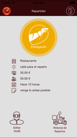 Flash food es una aplicación para uso propio dentro de la empresa Flash food. La aplicación permite a los restaurantes adheridos localizar el repartidor más cercano en cada momento. Los repartidores llevarán esta aplicación la cual les comunicará en cada momento a donde han de dirigirse. Ya sea a recoger un pedido a un restaurante o a entregarlo a un domicilio concreto. Además, la aplicación se conecta al sistema de gestión indicando al repartidor el estado en el que se encuentra: - Fuera de horario: No se le van a asignar pedidos ya que no está en horario de trabajo. - Disponible: Ha de estar preparado para recibir pedidos - No disponible: Ya tiene pedidos para entregar - Entregando: El repartidor se encuentra entregando pedidos. Se incluyen otras 2 pantallas donde poder consultar y modificar todos los datos personales y otra para consultar el historial de pedidos realizados.