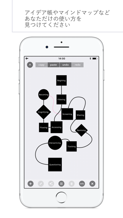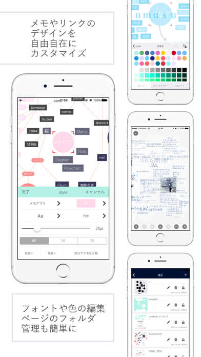 reteNote(リートノート)は、紙媒体にはない利便性と デスクトップアプリケーションにはない手軽さを兼ね備えた スマートデバイスの有効性を最大限に活かした新しいタイプのメモアプリケーションです。 ひらめきには色がついていませんか? そのひらめきはどんなかたちですか? でも、そのひらめきを書き留めるには 一般的なメモアプリではグラフィカルな機能が少ない。 かといって、グラフィックスに特化したアプリはメモには向いていない。 また、WYSIWYG的なアプリも手軽にメモをとるにはかたすぎる。 reteNoteなら、グラフィカルに、手軽に、メモをとることが出来ます。 ノートに付箋を貼るようなイメージでメモをどんどん追加していき、 色や形、配置を変えたり、メモ同士をリンクさせながら、 ノートを整理していくのが、reteNoteの基本的な使い方です。 紙のノートと違って、ページの数や大きさに制限はありません。 どこから書き始めても、どこまでもページを広げていくことができ、編集や削除も簡単です。 筆記用具がなくても、いつでもどこでも、手軽に綺麗なメモが取れることや どこに書いていいかわからないようなちょっとしたひらめきを気軽にメモしておけることも reteNoteの魅力の一つです。 メモの色、形、大きさ、フォント、配置も自由自在。 自由でシンプルなツールだからこそ、活用例は無限に広がっていきます。 思いついたとりとめのないことをちょっとメモしておいたり、 メモの配置を整理しながら思考やアイデアをまとめたり、 メモ同士を繋ぎあわせながら、マインドマップを作成したり、 色や形を工夫してtodoリストとして活用したり、 簡単な表やグラッフィックを作成することもできます。 reteNoteで、あなたのひらめきをデザインして、 あなただけのノートを作成しましょう。