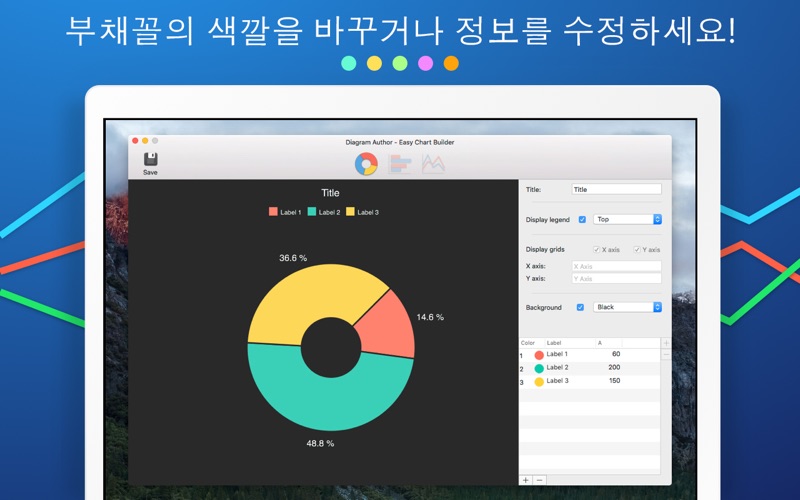 Diagram Author - Chart & Graph 앱은 차트, 그래프 및 다이어그램의 모든 종류 생성 및 맞춤 설정을 위한 포괄적인 결정입니다 ► 그래프의 모든 종류를 만듭니다 • 막대 그래프 • 원 그래프 • 선 도표 • 수평 막대 그래프 ►차트 맞춤 설정을 합니다 • 요소의 색상을 조정합니다 • 그래프 테마 및 배경을 선택하합니다 ►도표를 관리합니다 • .csv 파일에서 데이터를 가져옵니다 • 원하는 파일 형식으로 차트를 내보냅니다 Privacy policy: https://newtech-ltd.com/privacy Terms of use: https://newtech-ltd.com/tos