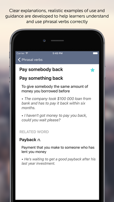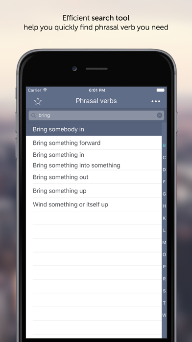 Phrasal Verbs Dictionary engage features to enhance your vocabulary: • Wide coverage of phrasal verbs mostly used in business language • Clear definitions and grammar patterns: synonyms, antonyms, similar verbs, related words and etc. • Example sentences show phrasal verbs in use • Quiz for self-assessment • Custom list of Favorite phrasal verbs • Efficient search tool help you quickly find the phrasal verb you need Phrasal Verbs Dictionary is iPhone & iPad compatible "universal app".