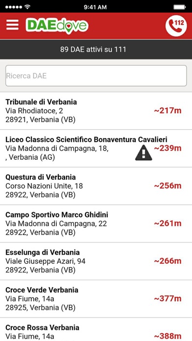 DAEdove è un’applicazione gratuita creata per fornire all’utente una mappa dei defibrillatori (DAE) semiautomatici esterni presenti sul territorio nazionale. Ogni defibrillatore segnalato sulla mappa è supportato da informazioni quali l’indirizzo di ubicazione dello stesso, il recapito telefonico del proprietario, gli orari di disponibilità dell’apparecchiatura. I dati dei DAE vengono inseriti e validati dagli utenti stessi. DAEdove è un’applicazione semplice da usare, intuitiva, pratica, veloce, essenziale ed è totalmente gratuita. - Lista completa ed aggiornata di tutti i defibrillatori semiautomatici esterni più vicini in base al punto in cui ci si trova (localizzazione GPS) - Informazioni complete (indirizzo, recapito telefonico, scadenze e orari di disponibilità del DAE) - Possibilità di segnalare la presenza di un defibrillatore nuovo, oppure esistente non segnalato - Gli utenti registrati possono modificare e/o validare i DAE inseriti - E' possibile effettuare una chiamata al numero unico d'emergenza direttamente dall'applicazione