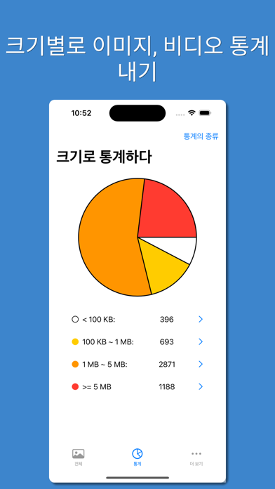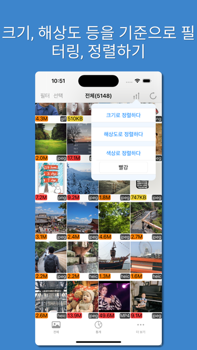 PhoTop은 사용하기 쉬운 이미지 및 비디오 유틸리티 앱입니다. 다양한 방법으로 도움을 줄 수 있습니다 1. 이미지 및 비디오 크기를 빠르게 확인: - 모든 이미지와 비디오를 쉽게 브라우징하고, 썸네일 아래에 크기가 표시됩니다. 색상 코딩을 사용하여 쉽게 식별할 수 있습니다. 예를 들어, 5MB를 초과하는 이미지는 빨간색으로 표시됩니다. 2. 라이브 포토 크기를 빠르게 확인: - 라이브 포토는 사진과 비디오 둘 다를 포함합니다. 각 부분의 크기가 표시되어, 저장 공간 사용 방법에 대해 더 명확하게 이해할 수 있습니다. 3. 이미지 및 비디오 정렬: 크기, 색상 또는 해상도별로 정렬합니다. 4. 이미지 및 비디오 필터링: - 크기, 날짜, 해상도, 색상 또는 형태별로 필터링합니다. 5. 이미지 크기 조정 및 압축: - 이미지 및 GIF의 크기를 줄입니다. 6. 원형 차트로 이미지 및 비디오 통계 보기. 7. 날짜별로 미디어 추적: - 이미지와 비디오가 많은 날짜를 식별합니다.