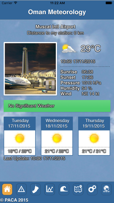 With „Oman Meteorology“ you get the free official Weather App featuring the highest quality weather forecasts for The Sultanate of Oman! „Oman Meteorology“ is provided to you by the national weather service of Oman, the Directorate General of Meteorology of the Public Authority for Civil Aviation. The Directorate General of Meteorology represents a most modern weather service operating the latest state of the art technology such as for example global meteorological satellite reception systems, several radar stations scanning the skies of Oman for distant or close thunderstorms or precipitation, many manned and automatic weather stations also in 24/7 operation as well as powerful supercomputers for the simulation calculation of the future Oman weather. Above all, a team of highly skilled and motivated weather experts interpret this observed and forecast data, ready to issue alerts or give advice at any time. Already this official weather information is provided to the public through the customizable Web site www.met.gov.om and now in addition the „Oman Meteorology“ App is launched taking into account the modern lifestyle with omnipresent mobile devices. The „Oman Meteorology“ App provides for the public an easy and convenient access to Oman weather local data, including but not limited to the latest composite radar image, the latest weather satellite image, the rain forecast map, up-to-date weather measurement observation and much more. In detail, the App offers these features: - three-days forecast for all stations within the Sultanate of Oman, automatically updated for the station nearest to you or for a pre-selected favourite station - several map forecasts including weather, wind, temperature, rainfall and pressure, giving you a perfect overview over the coming weather - severe weather warnings, advisories and information so that you are informed immediately if something is brewing - sunrise and sunset for each city with adapted icon sun/moon, perfect additional assistance to plan your day Of course the App is easy to use, providing an easy access to real-time weather status with the ability to swipe the screen or to switch between cities on a map with a simple click. Also the users can set their preferred units for the display for example for temperature Celsius or Fahrenheit, for Wind knots of km/h etc. The App also provides a link to the Web for additional information: - different types of weather charts and other products from simulations for Oman - sea state forecasts including wave and swell height and direction - special charts and products for aviation - historical climatological data for The Sultanate of Oman - actual observations, upper air soundings, ship and buoy reports, mean sea pressure analysis, upper air analysis, latest tropical cyclone tracks and forecast Most of all, the „Oman Meteorology“ App utilizes the specific advantageous possibilities of modern mobile devices to best reach the public to prevent weather related damages to health or property in Oman: When official weather warnings or advisories are issued by the Directorate General of Meteorology covering a region or the whole Sultanate of Oman they appear in real-time inside the App. This means that such important information cannot be missed anymore when an eye is kept on the App. In addition, the App interprets the current position of the user and can conveniently automatically display the information for the nearest weather station. The „Oman Meteorology“ App is the logical next step of the Directorate General of Meteorology of the Public Authority for Civil Aviation for providing best weather service and protection from weather related hazards to the people of Oman. This mobile solution supports its users in an ideal manner in planning daily activities or taking precautious measures.
