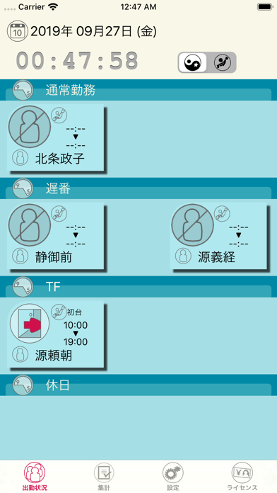 このアプリは従業員の出勤状況確認・勤務シフトの管理・出退勤の集計がiPhone/iPadで簡単にできるアプリです。 *出勤状況確認 ・本日の従業員の出勤状況を勤務地ごとや勤務シフトごとに切り替えて表示します。 (管理者は離れた場所から従業員の出勤状況を確認することが出来ます) *リアルタイム集計機能 ・今月および先月の全従業員の勤務データを一覧で表示します。 1) 全従業員の1ヶ月の集計情報の一覧 2) 従業員ごとに1ヶ月間の出退勤時刻データの一覧 3) 個別の日にちのデータの詳細表示と修正 ・集計データはCSV形式でエクスポートが可能です。 *シフト管理機能 ・従業員ごとの勤務日ごとの勤務シフトを簡単に登録できる機能です。 *従業員ごとのタイムカードの打刻(出勤時刻と退勤時刻)は、以下の2種類のiPhone/iPad アプリで行います。 ”OnWork ーあなたのスマホがタイムカードにー" 従業員個人のiPhoneをタイムカードにするアプリです。 GPSで打刻場所を確認し、事業所名を表示するため不正打刻を防止します。 ”OnWork InOut-Board ー出欠表示板とタイムカードが合体ー" 事業所に配置し、1台の端末で複数の従業員のタイムカード打刻を行います。 カメラにより打刻時の写真を記録することで本人確認を行い不正打刻を防止します。 ・小規模事務所、店舗等の労務管理に! ・3名分までは無料でご利用いただけますので、お気軽にユーザ登録して使い勝手をご確認下さい。