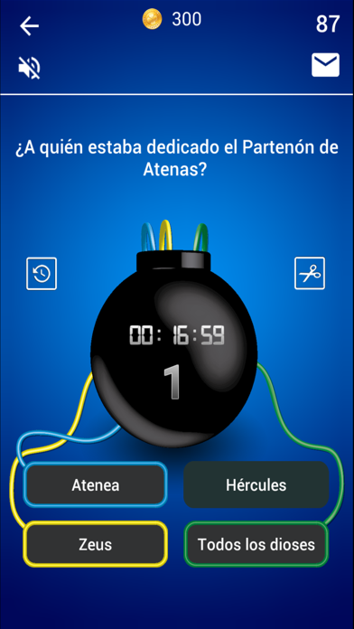 Boom! es un trepidante juego de preguntas y respuestas. El objetivo general es desactivar bombas, cuando la bomba explota pierdes. Cada bomba se desactiva escogiendo las respuestas incorrectas a la pregunta que se propone. Elige las respuestas incorrectas o boom! Instrucciones: - Cada bomba tiene 4 hilos, solo uno de ellos hace explotar la bomba. - Selecciona las 3 respuestas incorrectas para quitar los cables que no hacen explotar la bomba. Modos de juego: Boom: - Desactiva el máximo de bombas que puedas. - Cuando una bomba explota el juego finaliza. 10 bombas: - Hay un total de 10 bombas. - Desactiva el máximo de bombas que puedas. - Haz los máximos puntos que puedas. Niveles: - Desactiva todas las bombas para superar el nivel. - Cuando superas el nivel podrás acceder al siguiente nivel. Puedes ver tus progresos y comparar tus resultados con los de tus amigos con los rankings y los logros. Para poder acceder a ellos debes estar registrado a Google+ y disponer de conexión a Internet. En los rankings podrás ver cuál es tu mejor partida y en qué posición estás respecto a todos los jugadores. Cuando juegas puedes desbloquear logros. Hay muchos logros distintos. ¡Cuanto más juegues, más oportunidades tendrás de desbloquear logros!
