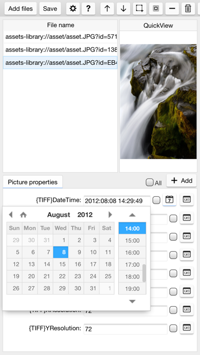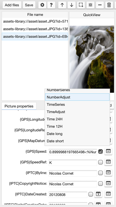 Change your photos' EXIF, IPTC, GPS... tags like a pro, directly on your iOS devices. You can select multiple photos from photo album, edit their tags, change them in a batch, and save them back to album. The property value can be set using variables, e.g. use today's date time, use filename, create number series, create date time series, copy from other property value, replace, truncate, uppercase, lowercase ... It also supports quick preview feature, which allows you to see the file's thumbnail while you edit it.