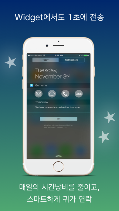 "Go home" is an app equipped with 3D Touch technology, which enables the speediest contact with your loved ones than ever. It accelerates communications with SMS, Email, Line and phone messages Thanks to the 3D Touch technology, the messages such as "I'm going home now" can be sent in one second Just like you feel some comfort when fingerprint authentication is unlocked 0.5 seconds faster than usual, "Go home" reduces time losses for seconds every day enabling smarter "I'm going home" notification. ※For LINE messages, the destinations must be selected because addressing is not supported by the specification of LINE. ・No cumbersome operations required. Registering addresses and sentences in the app only once enables you to send those sentences quickly to the registered addresses. Similarly, it enables you to make prompt phone calls to your specified addresses. Furthermore, as it is linked with iPhone address book, you can easily set addressees of your contacts. ・Non-3D Touch devices are supported as well. Even with non-3D Touch devices, you can send "I'm going home" message smartly in one second With the widget, you can send messages quickly even with other apps and browsers opened.
