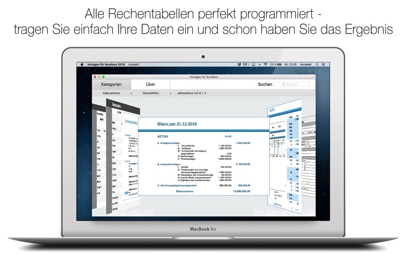 Private und geschäftliche Finanzen im Griff mit Numbers 2016! Tabellenkalkulationen für Numbers von Finanzprofis erstellt! Die ultimative Finanz-Vorlagensammlung für Geschäft und Privat, Edition 2016! Über 160 zertifizierte Kalkulationen, Tabellen, Diagramme, Formulare, Listen und Druckvorlagen in topaktuellem Design. Für Numbers optimiert, zu Excel kompatibel! Die Rechentabellen und Spread-Sheets sind perfekt programmiert, so dass Sie nur noch Ihre Daten eintragen müssen und die Ergebnisse werden errechnet. Features: ● Mehr als 160 Numbers 2016 Vorlagen ● Private und geschäftliche Spread Sheets, Kalkulationen, Tabellen, Diagramme und Druckvorlagen ● Übersichtlich nach Themen kategorisiert ● Cover Flow Vorschau und Suchfeld ● Optimiert für OS X 10 El Capitan Inhalt: ● Wirtschafts-Kalkulationen z.B. Absatz-/Umsatzzahlenübersicht, Absatz/Umsatz/Provision, Betriebskapitalberechnung. Jahresbilanz mit G + V, Break-Even Analyse, CASH FLOW Berechnung, Kosten Kalkulation, Kostenaufstellung, Jahreseinnahmen-/ausgabenübersicht, Einnahmen/Ausgaben monatlich, Einnahmekalkulation Freiberufler, Einnahmen-/Überschuss-Rechnung, FINANZPLAN, Gewinnbewertung FIFO, Unternehmensplan Jahresprojektion, Kosten Fuhrpark, Handelskalkulation, Rentabilität einer Investition mit Grafik, Kapitalberechnung, Kapitalwertberechnung, Kostenberechnung, Gewinnbewertung LIFO, Vergleich Leasing Kredit, Lineare/degressive AfA, Liquidität Feststellung, Liquiditätsplan, Maschinen-/Fertigungskosten, Preisberechnung mit Mengenrabatt, Produkt, Lebenszyklen, Projektinvestitionen, Verkaufsprovisionen, RESTWERTBERECHNUNG LEASING, Umsatz-Quartalsplanung, Umsatz Produktkosten Top Down, Kapitalansparzeit ● Private Kalkulationen Autocheckliste, Baudarlehen-Berechnung, Effektivzinsberechnung, Finanzanlagen Rechner, Handykostenüberwachung, Immobilienkalkulation, Jahreszivnserrechnung, Kaufen oder Mieten?, Monatszinserrechnung, Pflegeversicherungsleistungen, Ratenkreditberechnung, einfacher RENTENRECHNER, Rentnerrechnung, Sparplan, Tageszinserrechnung, Tilgungsplan Immobilien, Zinseszinsrechnung, Zinssatzerrechnung, Zinseszinstabelle ● Tabellen & Diagramme Aktiendepot Verwaltung, Aufwendungen pro Quartal, Benzinkosten Jahresverbrauch, Buchungsprotokoll, Buchungsbelege, Budget-Bericht ,Bürogeräteverwaltung, Energieverbrauch, Jahresübersicht, FAHRTKOSTENABRECHNUNG, Fixkosten-Übersicht, HAUSHALTSBUCH, Kassenbuch, Kfz-Betriebskosten EUR/CHF, Kfz Kaufpreisvergleich, Kfz-Kosten ohne Wertverlust,, Kontoführungskosten, Krankenversicherungs-Vergleich, Krankmeldungen Übersicht, Kundenliste, Wohnungsverwaltung, Portoübersicht, Rechnungsausgangsbuch, Rechnungseingangsbuch, REISEKOSTENABRECHNUNG, Stundennachweis, Umsatzdiagramm, Diagramme, Kreisdiagramm ● Formulare & Listen Aushang, Bestellung, Bestellung mit Kopie, Freistellungsauftrag, Gutschriftformular, Kfz Kaufvertrag, Kostenvoranschlag, LEBENSLAUF, Lohn-/Gehaltsabrechnungsformulare, Lohnabrechnung laufende Beschäftigung in geringem Umfang, Lohnabrechnung kurzfristige Beschäftigung, Mahnungsformulare, Quittungsformulare, Rechnungsformulare, Rechnungsformular mit Kopie, Unterrichtsbefreiung, Angebotsvergleich, Bankkonten Übersicht, Banken-IBAN-Verzeichnis, Preislisten, Werbeplan, Wochenplan ● Druckvorlagen Antwortpostkarte, Briefpapier, Etiketten, Faxvorlage Geburtstag, Faxvorlage Ostern, Faxvorlage Weihnachten, Registerdeckblatt A4, Ordnerregister, Paketaufkleber, Postkarte mit Losnummer Preisetiketten Zum Öffnen und Bearbeiten der Vorlagen wird die App "Numbers für Mac" von Apple benötigt! "Numbers für Mac" ist im Mac AppStore erhältlich!