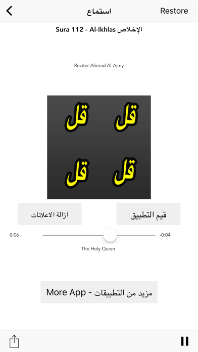 ** Listen to the 4 Quls of the Holy Quran in 1 APP ** ** Many reciters ** Best Recitation ** * GET the APP for FREE * There are four Quls in the Koran, these four surahs serve the purpose of protecting us from all mischief around us. 1. Sura 109 - Al-Kafirun (The Disbelievers) 2. Sura 112 - Al-Ikhlas (The Purity) 3. Sura 113 - Al-Falaq (The Day Break) 4. Sura 114 - An-Nas (The Mankind) Download the app to listen to Recitations by: /*/ Reciter Saad Al-Ghamdi /*/ Reciter Mahmoud Al-Hussary /*/ Reciter Ahmad Al-Ajmy /*/ Reciter Abu Bakr Al Shatri You can have a look at some of our others apps. You will find apps for all those reciters with the complete quran n them. Please if there is any feedback or future app updates recommendations don't hesitate to contact through our support URL Enjoy using our product. Enjoy listening to these sourates!