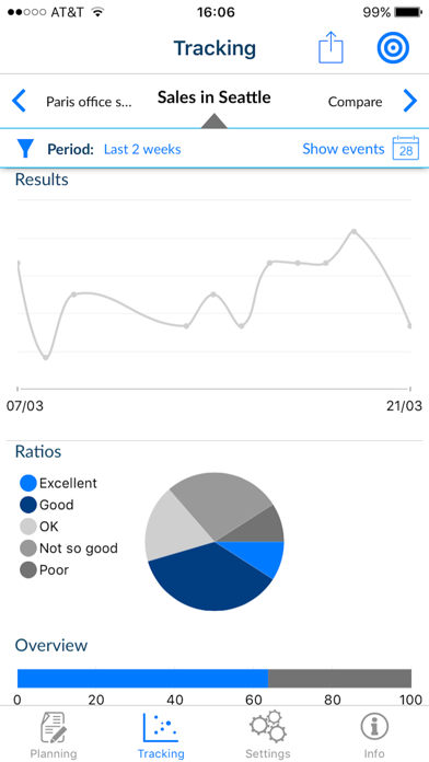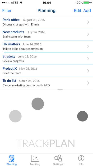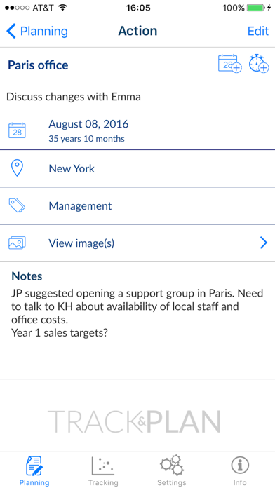 Track & Plan helps you achieve what you want to achieve. Set goals. Track progress. Plan for success. Track & Plan prompts you with a daily progress check- on your iPhone or your Apple Watch - and shows you a graphic analysis of how you are doing. Features - Track up to six goals and change them on the fly - Get prompted to check-in on how you are doing in Notifications on your iPhone or your Apple Watch each day at a time of your choosing - Review each goal achievement in a single graphic view - Compare your goal achievements against each other - Plan events that will support your goals - Add notes, photos and location to each event - Overview your progress by period, event group and event type - Use Spotlight™ to go straight where you want in the app - See what was going on that helped you achieve your goals Track & Plan. Motivation. Achievement. Success. It’s in your pocket.