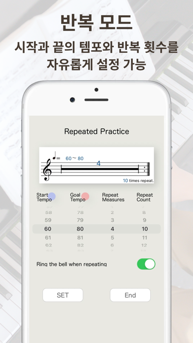 ■■어플이라 실현 가능했었던 연습용 서포트 기능■■ 반복 모드:일정의 마디 반복하며 자동으로 점점 빨라집니다. 프로그램 모드:마치 지휘자처럼 템포변화를 설정할 수 있습니다. 타이머탑재:훈련시간관리가 가능해 집니다. 시작은 천천히 자동적으로 점점 빨라 지게 할 수 있기 때문에 게임같은 느낌으로 효율적으로 즐겁게 악기연습을 할 수 있습니다. 또한, 프로그램 모드는 박자, 박수, 템포를 마음껏 설정하여 재생하는 것이 가능합니다. rit./accere도 대응 가능하여 보다 나은 연습이 가능합니다. 주요 기능 - 일반 메트로놈 기능 - 탭에 의한 템포 설정(화면을 일정 템포로 탭을 하면 그 템포로 설정이 됩니다.) - 반복모드:정해진 마디를 반복적으로 재생하는 기능 - 반복 재생을 점점 더 빨르게 할 수 있습니다. - 프로그램 모드 : 박자와 템포를 자유자재로 설정 가능합니다. - 타이머 탑재 - 8가지의 색 변경이 가능합니다.