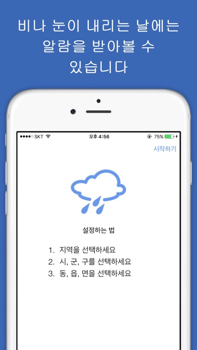 비나 눈이 내릴 때 알림을 받을 수 있도록 제작된 Application입니다. 기본적인 날씨 정보를 제공하며, 설정된 지역에 비나 눈이 내리면 사용자는 알림을 받아볼 수 있습니다. # 현재 지원 기능 - 날씨 정보 - 알림 설정 - 알림 시간 설정 # 추후 지원 기능 - UI 변경