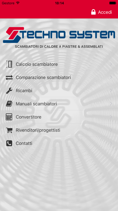 Scambiatori di calore a piastre per il settore civile e industriale Techno System srl produce fin dal 1983 scambiatori di calore a piastre di alta qualità nel pieno rispetto delle normative vigenti (PED con marcatura CE, ASME ecc.) Questa App aiuta ad identificare rapidamente gli scambiatori o i moduli preassemblati per gli usi civili standard, mentre per impieghi nel settore industriale permette di consultare i nostri tecnici che saranno immediatamente raggiungibili dalla sezione contatti. Con questa App è inoltre possibile trovare il fornitore più vicino nella zona di vostro interesse. Altre utilità interessanti sono un comodo ed utile convertitore di unità di misura termotecniche e un prontuario di comparazione di scambiatori simili.