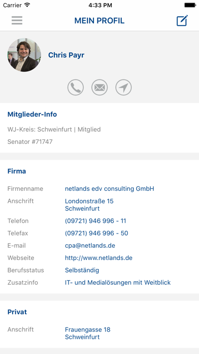 ====================================== Wirtschaftsjunioren Deutschland - Die Mitglieder App ====================================== Ganz nach dem Motto "Mein Verband in meiner Hand" steht mit der WJD Mitglieder App eine tolle Möglichkeit zur Verfügung, den Austausch und Kontakt untereinander noch weiter zu intensivieren. Das Herzstück ist das Mitgliederverzeichnis, welches Dir ermöglicht gezielt nach WJ Kolleginnen und Kollegen zu suchen und mit dem Du Dein komplettes WJ Adressbuch immer bei Dir hast. Der Zugriff auf den WJD Veranstaltungskalender gibt Dir einen Überblick über Kreisveranstaltungen in Deiner Region. Aktuelle Informationen aus dem Bund informieren in die „Junge Wirtschaft aktuell“ über Projekte, Aktionen und Aktuelles von WJD. Neumitglied oder WJ Interessent? Die WJD Mitglieder App versorgt Dich mit allen Informationen rund um unseren Verband. Überzeuge Dich aber selbst und probiere es einfach aus – unser Downloadtipp, die WJD App. Funktionsübersicht der WJD Mitglieder App: ================================ Mitgliederverzeichnis*: - Profile und Kontaktdaten unserer Mitglieder - Umfangreiche Such- und Filtermöglichkeit - Freunde und Favoriten - Profilpflege des eigenen Benutzerprofils * Mitgliederbereich nur für Mitglieder nach Login. Um auf den geschützten Bereich der WJD Mitglieder-App zugreifen zu können, benötigt Ihr Eure Zugangsdaten zum internen WJD-Portal (www.wjd.de) Junge Wirtschaft aktuell: - Aktuelle Informationen und Neuigkeiten aus dem Verband - schnell, leicht und jederzeit zugänglich Infos über WJD: - Infos und Fakten über die Wirtschaftsjunioren, unsere Partner und unsere Struktur für alle WJ Neulinge und Interessierte WJD Kreisverzeichnis: - Kreissuche - Anzeige öffentlicher Amtsträger und Kontaktdaten Veranstaltungsverzeichnis: - Übersicht in der WJD Webplattform gepflegter Veranstaltungen aus Kreis, Land und Bund - Umfangreiche Such- und Filtermöglichkeit ======================================================================== Mit der WJD Mitglieder App hast Du aktuelle Informationen über die Wirtschaftsjunioren jederzeit in Deiner Hand und bist optimal mit anderen Wirtschaftsjunioren vernetzt.