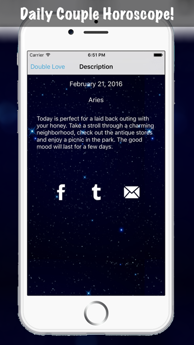 Daily Horoscope gives you professional daily prediction based on your zodiac signs. The data are provided by highly professional horoscope experts updated every day! Furthermore, you can check your fortune on your love, partner, work, finance and more! Features: - Daily horoscope prediction! - Simple and intuitive app to read your horoscope prediction anytime anywhere! - Specific horoscope prediction for your love, partner, work, finance, as well as general daily fortune! - Check your own zodiac signs including all other zodiacs of your friends and partner! - Share the horoscope prediction directly to Email, Facebook, and Twitter! - Discover all the awesome features by yourself! Download Daily Horoscope for free now and have fun checking and reading professional predictions based on your zodiac signs!