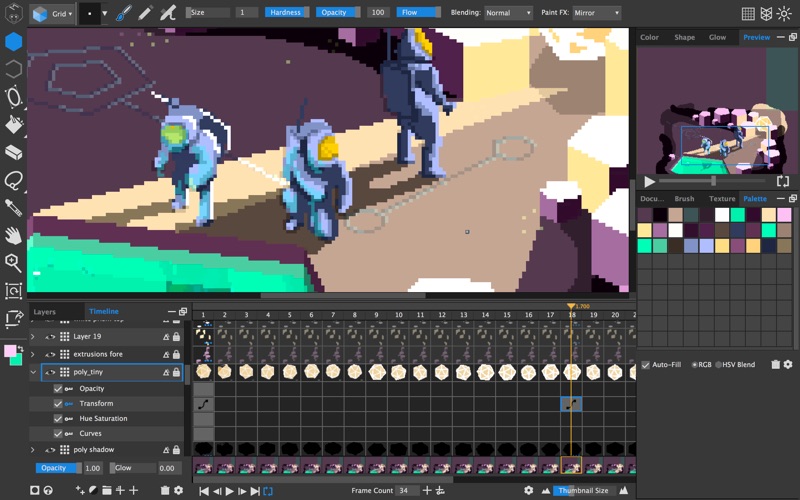 Marmoset Hexels is a unique, grid-based painting tool for vector art, pixel art, design, and animation. HEXELATE! At the heart of Hexels lies a paintable grid of geometric shapes: a tessellating canvas built of hexagons, triangles, squares, and custom polygons. The Hexels grid allows artists to create complex vector designs with the stroke of a brush. It is a new kind of workflow that's intuitive and easy to pick up by a beginner, and a versatile tool in the hands of a pro. PIXELATE! The grid-based canvas in Hexels is a natural fit for the forward-thinking pixel artist. Make full use of the same great drawing tools. Keep track of colors and gradients with the palette. Set your canvas in motion with the animation timeline. Export a sprite sheet for every princess in every castle. CONSTRUCT! For the craftsman looking to build worlds, Hexels provides a set of grids and guides for drafting all forms of isometric art. Raise walls, carve mountains, bend perspective to your will and build impossible wonders. DETAIL! Pixels and Trixels living in harmony! Hexels lets you combine layers of vector and pixel art on the same canvas. Complement angular Hexel art with soft, sweeping brushwork. Carve pixel-perfect trim into isometric art. Block out whole cities in vector form, then dive in for the details. RASTERIZE! Hexels gives you full control over the vector-to-pixel rendering process. Advanced rasterization tools provide vector alignment, pixel-perfect isometric art, pixel scaling, and antialiasing at any export resolution. And because Hexels renders everything on the GPU, you'll see a pixel-perfect preview on the canvas as you paint. ANIMATE! Build a world and bring it to life with the Hexels animation timeline. Breathe subtle motion into a still image with post effects and motion curves. Send shapes and colors twirling with layer transforms. Or tell a hand-drawn tale with a simple flipbook animation. PATTERN! Hexels is the perfect tool for exploring tiling designs and geometries. Paint tessellating patterns on an endless canvas. Explore advanced grid types like Voronoi. Draft your own grids with a powerful custom grid designer. Whether you are creating textiles or laying out an elaborate mosaic, Hexels can help. DESIGN! Hexels is a versatile tool for the graphic artist working with with multiple applications, at a print-ready resolution. Assemble your canvas out of existing images and animations. Keep organized with layers, masks and groups. Add a pinch of procedural with a library of real-time post effects and shaders. Then export an SVG or layered PSD of your canvas for final touch-ups elsewhere. Featured artwork by Mark Knight, Mira Karouta, Tabby Rose, Saskia Freeke