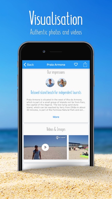 Looking for the perfect holiday beach in the Algarve? Want to know where the most popular beaches in the region are and discover some insider's tips? That's why we've developed the Beach-Inspector Algarve app! Our team has visited all the beaches personally and reviewed them for you based on a strictly standardised process. Photos and videos give an authentic visual impression of the beach. We want to help you find your dream beach as easily as possible and we understand that every holidaymaker has different needs and wants. Whether you're looking for relaxation, want as much water sports action as possible or just want to spend a few sunny days with the family, we know how well each specific beach will suit you. This is how the Beach-Inspector Algarve app works: • Discover all the beaches in the Algarve and find your perfect holiday beach quickly • Search by four main holiday types (relaxation, family, water sports and party) and lots of other filters • Get an overview of the beaches' locations using our Algarve beach map • Find recommendations for popular beaches, insider's tips, etc. • Gather all the information about the beach including videos and photos taken on location • Get directions to your dream beach using Google Maps navigation About Beach-Inspector.com: • We are the first digital beach search engine • Our mission is to rethink the approach to beach holidays completely • You will find lots more holiday destinations on our website and in the App Store • By the end of 2017 we aim to have all the relevant holiday beaches in the world on our website • We assess all the beaches ourselves - on location, factually and objectively • We want to help all our users find their perfect holiday beach as quickly as possible • Once you've found your dream beach, we provide an overview of all the hotels near the beach Download the Beach-Inspector Algarve app now! We're always keen to improve - please help us with your feedback: [email protected] Follows us on Facebook: https://www.facebook.com/de.beachinspector/?fref=ts Get to know Beach-Inspector better and discover lots more holiday destinations at http://www.beach-inspector.com/en