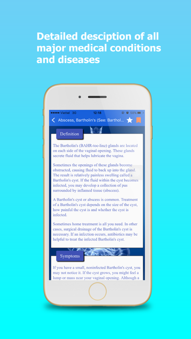 Diseases dictionary is a hand book more like a Medical dictionary for emergency lookup on disease names to assist individuals and to Physicians. Diseases Dictionary is a leading medical word dictionary used by health care professionals today in this modern technology world. Main Features: 1. Offline – It wok offline, no active internet connection is required; 2. Detailed description of all major medical conditions and diseases: - definition; - symptoms; - causes; - risk factors; - complications; - preparing for your appointment; - tests and diagnosis; - treatments and drugs; - lifestyle and home remedies 3. Equipped with quick dynamic search function – The dictionary will start searching for the words while you type. 4. Easy way to share with your friends. 5. Bookmark – you are able to bookmark the Disease Terms to your list 6. Managing Bookmark Lists – you are able edit your bookmark lists or clear them. DISCLAIMER: This app cannot and should not replace a pharmacist or a doctor consultation. App content is only for pocket reference & educational purposes. Consult a doctor before actual usage of any of the information in this app.