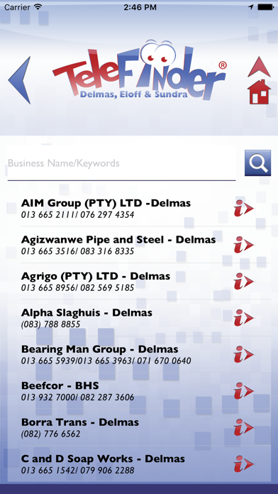 Telefinder ® Delmas is a up to date Business, Telephone and Information directory that consist of telephone numbers, cell phone numbers and addresses of available businesses and originations in and around this region. An alphabetical and classified list of all Telefinder advertisers is easily accessible and the telephone directory offers the most recent and up to date business information. Telefinder listings are integrated with Maps and can pin point small or large businesses as well as navigate the user from their current location to their desired destination. In the app we have functionality for: Click-to-call Navigation Email Website Search for businesses Emergency Numbers