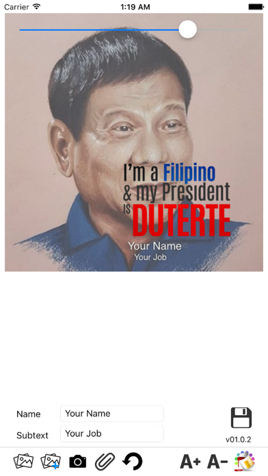 This app will allow you to select a photo and include your name and job to create a profile picture with your selected overlay or background. How to use the app: 1. Click the camera icon from the toolbar to take a new photo or click the attach icon to use an existing photo from your gallery. 2. You can select different overlay by clicking the Gallery button 3. You can rotate your image using the Rotate button. 4. You can adjust the opacity or blurriness of the image using the slider above. 5. You can adjust the text size of your name by clicking the A+ and A- buttons. 6. You can choose a colour for your name by clicking the color picker button on the right-most part of the toolbar. 7. Click Save when you are done. 8. Image will be saved to your Gallery. Thanks for using the app. SHARE the app to your FB or Twitter using this link: https://itunes.apple.com/us/app/du30-my-photo/id1105944579?ls=1&mt=8 Follow me on Twitter: https://twitter.com/Duterte24x7/ Facebook Page: https://facebook.com/Duterte24x7/ #ChangeIsComing #DUTERTE2016
