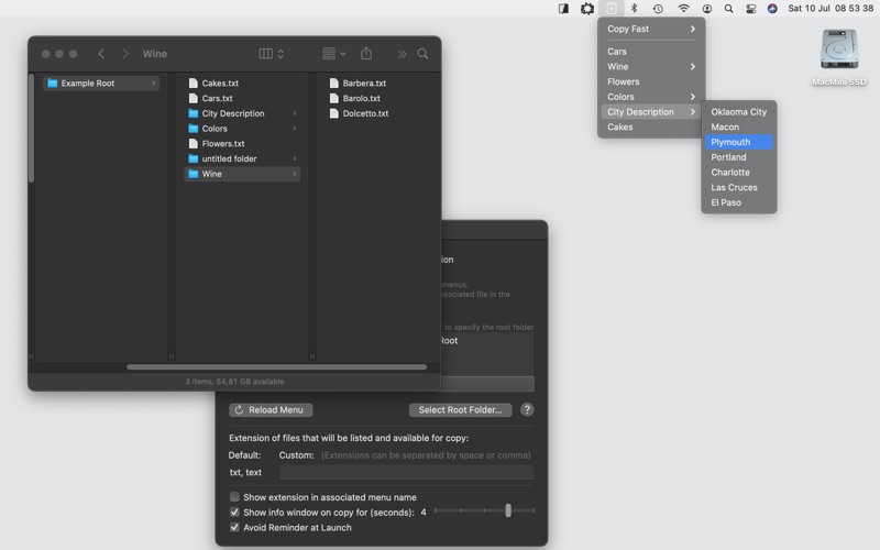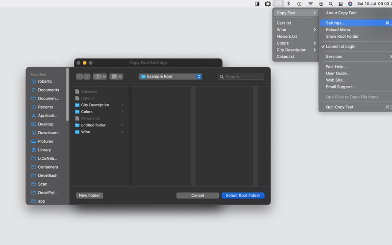 Copy Fast is a simple yet powerful application that lets you instantly copy organized file content to your clipboard with just one click. Whether you're working in another application or just need to quickly access a file, Copy Fast is always accessible from the right part of your menu bar. Features: • Instantly copy file content to clipboard with one click • Keep a list of all the files in a root folder you specify • Ability to specify multiple root folders and switch active root folder easily • Accessible from any application you use via the menu bar • Hierarchical file organization with submenus • Option to open selected file with preferred editor • Feedback on content copied to clipboard via pop-up info window • Option to show or hide file extensions • Fast and efficient launch, small in size • Run at startup for easy access from menu bar • Compatible with MacOS 10.13 High Sierra and above • Copy Fast is designed to be fast and efficient, launching in a blink and working in the background from the menu bar. • The application is set up only once, specifying the root folders containing your files, and it can be run at startup so it's always ready and accessible from any application you use. • With the ability to switch between multiple root folders, Copy Fast provides a flexible and customizable solution for all your file organization and copy-pasting needs. Get your copy of Copy Fast today and experience the difference for yourself.
