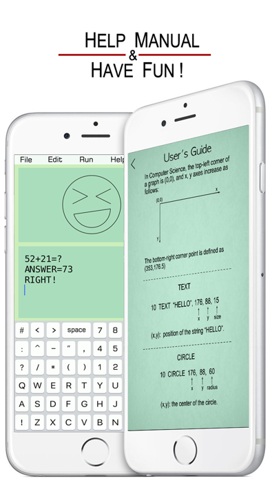 BASIC: 옛날 좋은 시절의 느낌 ! 그리운 프로그램 언어 ! 10 INPUT A 20 B = SIN(A) 30 PRINT "ANSWER: ", B 40 END BASIC 사용 설명서: • PRINT 10 PRINT "HELLO WORLD !" 20 END • INPUT 10 INPUT “A=”, A 20 PRINT A 30 END • IF...THEN... Number Comparison: 10 INPUT A 20 IF A>90 THEN B=“A” 30 PRINT B 40 END Conditional Operators: > greater than < less than >= greater than or equal to => equal to or greater than <= less than or equal to =< equal to or less than = equal to == equal to <> not equal to != not equal to THEN can be followed by GOTO, GOSUB, INPUT, PRINT. String Comparison: 10 INPUT A 20 IF A=“TOM” THEN PRINT “BOY” 30 END Conditional Operators: = is == is <> is not != is not • FOR...NEXT... 10 FOR I=1 TO 4 STEP 2 20 PRINT “HELLO”, I 30 NEXT I 40 END STEP specifies the counter increment for each loop. If STEP doesn’t exit, the default increment is 1. FOR...NEXT... loop can be nested. 10 FOR I=1 TO 5 20 FOR J=1 TO 4 30 PRINT I, J 40 NEXT J 50 NEXT I 60 END • GOTO 10 ... 20 ... 30 ... 40 GOTO 10 50 ... • GOSUB 10 PRINT “H” 20 GOSUB 100 30 PRINT “L” 40 END 100 PRINT “A” 110 RETURN • SOUND 10 SOUND C, M, 0.5 The line 10 plays Middle C piano note for 0.5 seconds. Note: C, C#, D, D#, E, F, F#, G, G#, A, A#, B Pitch Range: L (low), M (middle), H (high) Lasting Time: specifies how long a note lasts. C, D, E, F, G, A, B can also be labeled as 1, 2, 3, 4, 5, 6, 7. (C# as 1#). • TEXT 10 TEXT “HELLO”, x, y, size (x,y): position of the string “HELLO”. • CIRCLE 10 CIRCLE x, y, radius (x,y): the center of the circle. • RECTANGLE 10 RECT x, y, width, height (x,y): top-left point of the rectangle. • LINE 10 LINE x1, y1, x2, y2 (x1,y1): the starting point of the line. (x2,y2): the ending point of the line. • POINT 10 POINT x, y (x,y): the position of the point. • CLR: clear the edit window. • CLS: clear the graph window. • DELAY 10 DELAY 0.5 0.5:lasting time in seconds This function is used to suspend execution of a program for a particular time. • CURVE 10 CURVE x, y, radius, 0, PI 0: starting angle PI: ending angle The curve draws clockwise with center (x,y). • Mathematical Functions: SIN(X), COS(X), TAN(X), COT(X), ASIN(X), ACOS(X), ATAN(X), SINH(X), COSH(X), TANH(X), ASINH(X), ACOSH(X), ATANH(X). SQR(X): square root of x. ABS(X): absolute value of x. FCT(X): x factorial. LOG(X): natural logarithm of x. LOG10(X): base-10 logarithm of x. LOG2(X) :base-2 logarithm of x. EXP(X): base-e exponential of x. ERF(X): the error function of x. ERFC(X): the complementary error function of x. ROUND(X) :integral nearest to x. CEIL(X): the smallest integral that is not less than x. FLOOR(X): the largest integral that is not greater than x. TGAMMA(X): the gamma function of x. LGAMMA(X): the natural logarithm of the absolute value of the gamma function of x. • Reserved Variables: INKEY : once a key is pressed, the value of INKEY changes. RND : a random number. PI : π • Some Tips: 1. Undo & Redo typing on iPhone with a shake. 2. Copy an Emoji or some character from other places (like Notes), then paste them on the edit window. 3. Exponentiation is expressed as X^Y.