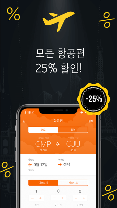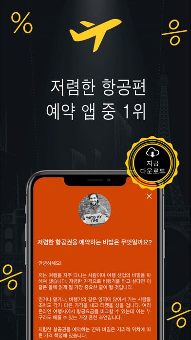 보너스! 최고의 여행 팁 15가지 제공! 돈을 절약하는 최고의 팁! ***, 화요일 또는 토요일에 떠나세요 자세히 알아보려면 지금 다운로드하세요! 세계 최고의 항공편 검색 앱, Cheap Flights는 저렴한 항공편을 빠르게 찾아줍니다. 수백만의 항공편과 수백 개의 항공사를 단 몇 초 만에 비교해 줍니다. Cheap Flights는 빠르고 유연한 데다 무료입니다! 이동 중에 좋은 항공편을 찾고 싶으세요? Cheap Flights로 돈과 시간을 절약하십시오. 전 세계 수백 개 항공사의 수백만의 항공편을 광범위한 제공 범위에서 검색할 수 있습니다. 고객에게 꼭 맞는 가장 저렴한 항공편을 적은 비용으로 예약 검색할 수 있습니다. 꼭 맞는 항공편을 찾으면 해당 항공사나 여행사로 연결하여 최저가의 항공편을 직접 구매할 수 있도록 해 드립니다. 이 모든 것이 클릭 몇 번으로 이루어집니다. 기능: 가격, 좌석 등급, 항공사, 이륙 및 착륙 시간을 기준으로 결과를 필터링합니다. 차트 보기: 일주일 또는 한 달 전체의 가격을 볼 수 있습니다. 100% 보안. 더 많은 땡처리 항공권을 보려면 Cheap Flights를 다운로드하세요! 저렴한항공권