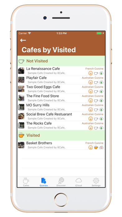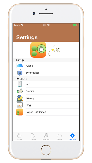 8Cafe is all about coffee, and its cafe culture, integrating Apple's iCloud sharing functionality. The design concept is elegant simplicity, offering an intuitive interface to add your cafes experiences and, optionally, share with the world. 1. Add your cafes to your local iPhone/iPad (with photos, name, type, location, phone, notes, visited flag and an Emoji rating), share via your favourite social network (Facebook, Twitter, etc.), upload to a public Cloud and backup/restore to/from your private iCloud. 2. Take unlimited photos of your favourite cafe, the last photo becomes the main and thumbnail in the Cafes table view unless/until you select a Favourite cafe in the Cafe Photos collection view. 3. Discover all users uploaded cafe records, shared in the public Discover Cloud, then copy any cafe record to your local iPhone if/when desired, simply touch/tap the Cloud cafe record (or swipe right to left for a menu of options: Download and Report). 4. In any table view (Cafes, Cloud) swipe right-to-left for a row menu of actions. In Cafes, you can swipe left-to-right to Share, Edit or Delete or (iOS11) swipe right-to-left to toggle the Visited and Uploaded flags. In public Discover you can Download and Report (refer to Apple's User Generated Content guidelines). 5. When adding a New Cafe, you can use your iPhone camera (to capture a new photo) or access your Photo Library and select a pre-taken photo. 6. Cafe details page allows ratings, edit, flag as uploaded to cloud, flag as visited, shows a map of the cafe location/address (which, when tapped, shows a full screen map) and your personal notes. 7. iCloud Backup and Restore allows you to query (compare iPhone/iPad to iCloud), upload and download from your private iCloud account (protected by Apple security). Explore, Enjoy and Share Your Cafes!