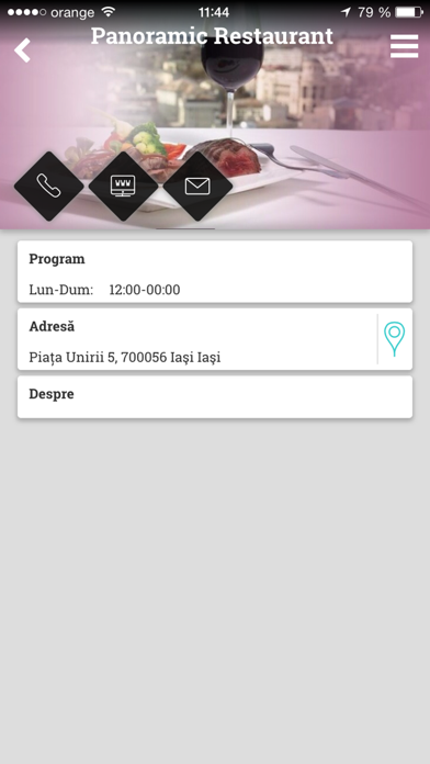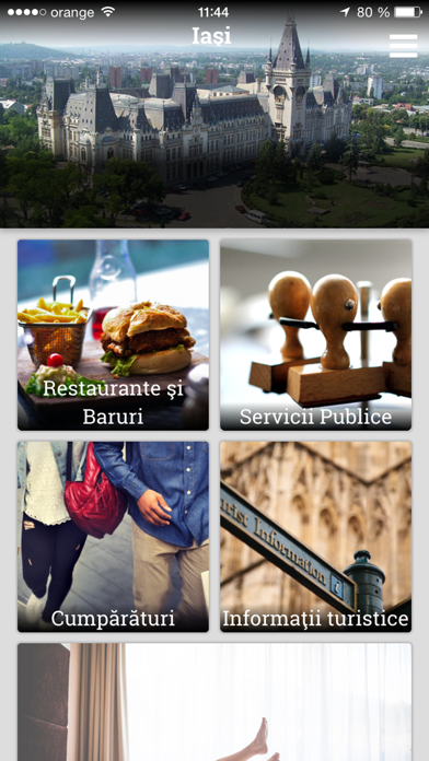 EN & RO EN. Iasi Official App is a tourist application administered by the Cityhall of Iasi that is dedicated to the Iasi city area, Iasi county, in Romania. It is aimed at both tourists and locals with various interests that are offered detailed information on most attractive POIs and events in the area, as well as on existing local services (accommodation, restaurants, bars, tourist info points and offices) or local news (city hall press reports). The content is updated real-time and is continuously subject to improving in order to provide accurate and relevant info. The current version of the Iasi Official App contains the following themes: - Accommodation: places in Iasi city that offer accommodation to tourists; - Culture & Leisure: places in and around Iasi that offer cultural and leisure activities; - Events Calendar: events that take place in Iasi city; - Food & Drink: places in Iasi that serve food and drinks; - Press Report: news that can be found on the City Hall website; - Sightseeing: places that are worth visiting in and around Iasi; - Tourist Info: official tourist info points and offices where a tourist can get information on what to see and to do in and around the city of Iasi; - Other themes (f. ex. shopping, citizen services) can be added to the app by the Cityhall once they have relevant content; the app will update itself when new themes are added. All POIs contain relevant information (photos, text, address, telephone and cell phone number with the possibility to call using the call function of the device, email address with the possibility to send a message using the email function of the device, website, opening hours, location of the POIs shown on Google maps, routing options) Alphabetical and by distance sorting options are implemented. Also, various filtering options are available, according to the type of POIs. Language switch is available (Romanian, English, German) directly from the application. RO. Iasi Official App este o aplicatie turistica administrata de primaria Iasi, menita sa promoveze zona orasului Iasi, judetul Iasi, Romania. Aplicatia este destinata atat turistilor, cat si localnicilor carora le sunt oferite informatii referitoare la cele mai atractive puncte de interes si evenimente din zona, la servicii (cazare, restaurante, baruri, puncte si birouri de informatii turistice) sau stiri locale (comunicate de presa ale primariei). Versiunea actuala de Iasi Official App contine urmatoarele teme: - Cazare: unitatile de cazare din Iasi; - Cultura si Timp liber: locatiile din zona Iasi care ofera activitati culturale si de relaxare; - Restaurante si Baruri: locatii in Iasi unde se poate servi masa; - Comunicate de Presa: noutati oferite de pagina de web a primariei; - Obiective Turistice: punctele de interes ce merita vizitate; - Turism: birourile si punctele de informatii turistice de unde turistii pot obtine informatii despre ce se poate face si vizita in zona Iasi; - Alte teme (ca de exemplu, Cumparaturii si Servicii Publice) vor fi adaugate de Primaria Iasi atunci cand vor exista informatii relevante pentru aceste teme. Toate punctele de interes contin detalii precum: imagini, text, adresa, telefon/telefon mobil cu posibilitatea de apelare directa, adresa de email cu posibilitatea de a trimite mesaj folosind functia email a telefonului, website, orar, locatie pe Google maps si optiuni de navigatie. Toate elementele pot fi sortate alfabetic sau dupa distanta. De asemenea, se pot folosi optiuni de filtrare, in functie de tipul de punct de interes. Aplicatia se poate folosi in 3 limbi (Romana, Engleza, Germana) care pot fi schimbate din menu-ul aplicatiei.