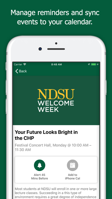 Stay in the know with everything that is happening for Welcome Week 2018! The Welcome Week app will serve as your schedule for Welcome Week and help to ensure that you start off on the right foot at NDSU. You'll be able to view the full schedule, add events to your personal schedule, and stay up-to-date with live updates and notifications.