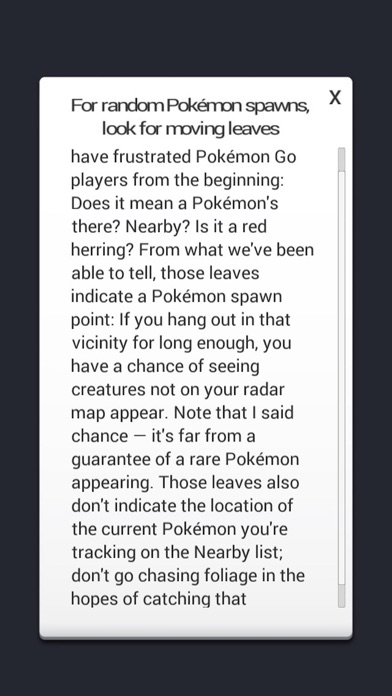 Get the most used tips and tricks for Pokemon Go and become a master trainer. * Hunt in pairs * Use your radar ring to discover Pokemon * Visit parks with multiple Pokestops * Playing during off-hours * and lots more... Works offline too. Legal Notice/Disclaimer: This guide is an unofficial version and is not endorsed by or affiliated with the creator of this video game or its licensors. This application complies with the US Copyright law guidelines for "fair use". All characters, their names, places, and other aspects of the video game described within this application are trademarked by their respective owners. This application does not copy any portion of the game, nor does it contain screenshots of the game, only original text descriptions. If you feel there a direct copyright or trademark violation that doesn't follow within the "fair use" guidelines, please contact us directly to discuss.