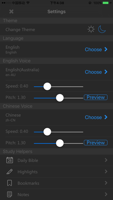 Wish you a very happy new year 2017! Bibles for study, listen, or just plain reading; translations from the traditional King James Bible (KJV) audiobook to the contemporary NIV & ASV & NASV & RSV & NRSV & BBE & WEB & Chinese Union Version and more. gifts for Mom, Dad, and kids; Bibles in just about nice style. Find the right Bible at a great price! It includes Daily Audio Bible, Interlinear Bible, Search, Favorite, Note, Highlight, Sharing Verses, listen on the train, at the airport, in the car. Wherever you go, the Bible goes with you, believes that God’s words must reach everyone easily, quickly , clearly and freely. FEATURES: ◎ The Complete (KJV, NIV, ASV, RSV, NRSV, NASV, BBE, WEB) and Chinese Union Version (CUV,CNV,LCC,TCB,CLB) on your iOS Device ◎ Fully functional even offline ◎ Bookmarking, highlighting,noting,and other features ◎ English Bible Audio Support (America,England,Australia,Ireland,South Africa),can switch to play ◎ Chinese Bible Audio Support(Mandarin, Cantonese),can switch to play ◎ CUV, KJV, NIV, ASV, RSV, Chinese/English Bilingual Bible READ, LISTEN & STUDY BIBLE ◎Offline Bible Study Works offline. Read, Listen, Study,notes, highlights and all of the app features offline,it doesn't need to connect to the internet. ◎Daily Audio Bible a year Daily Audio Bible is committed to helping Christian’s get into a daily rhythm with the Bible and prayer - Read and Listen Daily Bible every day - To receive Daily Bible Reading every morning - Share Daily Bible via Facebook,Twitter,SMS,Email,Save to Picture,Print,or Copy in just a tap。 ◎Study Bible - Search and find verses quickly and easily - Bookmark your favorite verses for quick retrieval later or to save stopping points. - Highlight: Use the highlight feature to make highlights in different colors. Then easily access them in the Highlights tab. - Notes function allows input of individual notes/commentary for any verse of the Bible. - History:shows previously viewed passages for easy navigation without losing your place. - Repeat playback of Verses or Chapters. - Quick Jump: You can also quickly read from your last stop. - Daily Bible a year: Get the daily Bible verse each day ◎ Interlinear Bible Chinese English Bible Interlinear:KJV/NIV, KJV/RSV, KJV/KJV - Chinese Union Version and much more... ◎ Bible Widget Get inspired daily with a Daily Bible Verse of Day widget ◎Share God's holy words Instantly share the Bible with your friends from inside the app. Share your favorite Bible verses with friends easily through Twitter, Facebook, Email, Wechat, Convert Text to Image and Save To Photo or Print God's holy words. ◎Theme Light or Night theme for easier reading. ENGLISH TRANSLATIONS: - KJV - King James Version - NIV - New International Version - ASV - American Standard Version - NASV - New American Standard Version - RSV - Revised Standard Version - NRSV - New Revised Standard Version - BBE - Bible in Basic English - WEB - World English Bible - DBY - The English Darby Bible - YLT - Young's Literal Translation And much more... CHINESE TRANSLATIONS: - CUV - Chinese Union Version (Simplified / Traditional ) - CNV - Chinese New Version(Simplified / Traditional ) - LCC - Lu Zhen Zhong Bible Translation - TCB - Today's Chinese Version - CLB - The Chinese Living Bible INTERLINEAR BIBLE: - KJV - NIV - KJV - ASV - KJV - RSV - KJV - Chinese Union Version(Simplified) - KJV - Chinese Union Version(Traditional) - NIV - Chinese Union Version(Simplified) - NIV - Chinese Union Version(Traditional) - ASV - Chinese Union Version(Simplified) - ASV - Chinese Union Version(Traditional) - RSV - Chinese Union Version(Simplified) - RSV - Chinese Union Version(Traditional) Keywords: Bible,Christian,bible app,church app,holy bible,bible apps,the bible,bible hub,audio bible,holy bible kjv, niv bible, study bible,biblia,kjv,bible niv ----------------------- LANGUAGES: English,German,Korean,Portuguese,Simplified Chinese,Traditional Chinese,Spanish