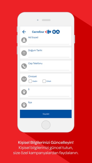 CarrefourSA Kart mobil uygulaması ile en özel kampanyalar ve anında kullanabileceğiniz puanlar her an, her yerde sizinle! Ücretsiz CarrefourSA Kart uygulamamız sayesinde size özel kampanyalardan hızlıca haberdar olabilir; mobil cihazlarınız ile CarrefourSA’nın fırsatlar dünyasını ayağınıza getiren kişisel hesabınızı hızlıca oluşturabilirsiniz.