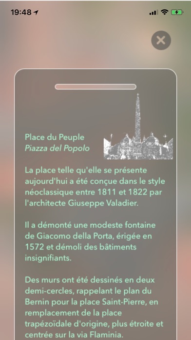 Vraiment conçue pour visiter les monuments judicieusement. - Un plein écran pour des vues encore plus captivantes. - Un menu intuitif avec des fonctions indispensables, des accès rapide, les lieux d'intérêt sont classés, numérotés avec une fiche de description et l'itinéraire pour y aller. - Une carte hybrid pour vous indiquer l'état de la circulation en temps réel. - Une fonction 3D pour vous aider à maîtriser le bon geste, - Le menu disparaît pour apparaître une vue plus étendue. - planer avec des plans de vues vraiment impressionnantes, sur des lieux stratégiques, grace au mode Flyover. En 3D tout se forme... Vous prendrez du plaisir à analyser : - l'impressionnant Colisée - le Capitole - la célèbre Fontaine de Trévi - ces magnifiques rues - le Forum romain - les chars romains sur le Monument de Vittorio Emanuel II - le Vatican, etc... C'est fascinant ! Il y a tant à explorer ! Le relief est saisissant ! Des secrets d'architectures dévoilés, un graphisme surprenant proche de la réalité. À manipuler, vous verrez, c'est vraiment très simple... Touche 3D pour vous aidez à maitriser le geste. Jouez aussi avec l'angle de vue et régalez-vous ! Un air de vacances avant d'y être. Cette application, c'est aussi un petit guide touristique, elle vous indique les lieux avec leurs itinéraires vers un point de stationnement. Du Colisée au Monument Vittorio Emanuel II, de la Place Navona au Panthéon, à pied, à vélo, ou en voiture c'est un vrai régal ! Cette application est étudiée pour une utilisation simple, agréable, précise et ludique. - un menu de présentation - photos, - itinéraire - vue satellite, hybrid et standard. - zoom - épingle numérotés sur les monuments. - votre position GPS - un raccourcie appareil photo