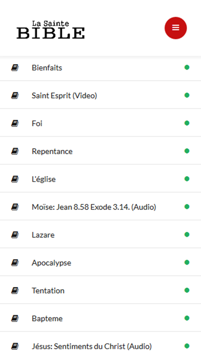 Bienvenue dans La Sainte Bible Etude Biblique familiarizar al lector con las enseñanzas de Dios a todos por medio de la Biblia la Palabra de Dios. Information biblique, matériel d'étude, activitiés , Comprendre la Sainte Bible! Détails: - LES BIENFAITS DE L'ETUDE DE LA BIBLE - Saint Esprit: "un autre consolateur" - La foi et les œuvres: celui qui a vraiment la foi, aura aussi les œuvres - Etude Biblique: Repentance - L'église: sa définition, son chef et ses membres - Moïse et Élie dans la transfiguration du Seigneur - Lazare et l'homme riche - Les références aux âmes dans Apocalypse 6:9 et Apocalypse 20:4 - Tentation: Dieu nous tente-t-Il par le mal? - Etude Biblique: Le Bapteme - Etude sur différents sujets de la Bible - Dieu a un plan pour la famille Autres études bibliques sur L'Esprit Saint. Le but de cette application est de vous faire découvrir la Sainte Bible, son message pour chacun de nous.