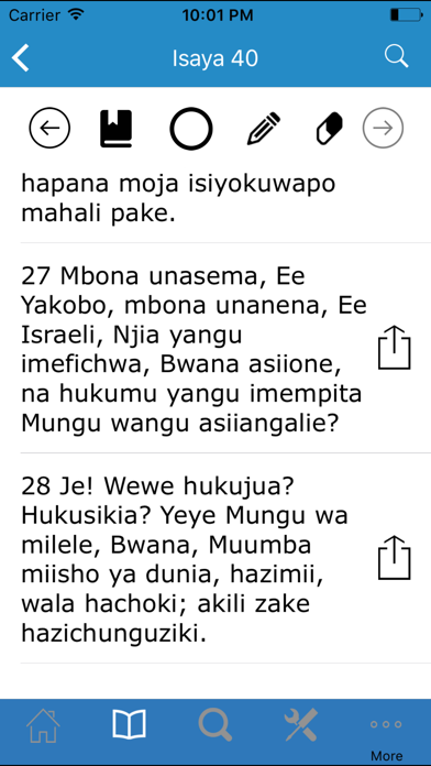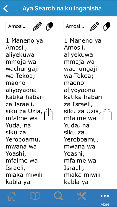 Programu-tumizi hii ya Biblia ina mistari,sura na vitabu vya Biblia. Tumehusisha vipengele vingi kuboresha kusoma kwako kwa Biblia. Kutafuta Unaweza kutumia kisaidizi katika programu-tafiti hii kukusaidia kupata mistari ya Biblia inayohusu mada tofauti tofauti. Kwa urahisi, unaandika unalolitafuta na programu-tumizi hii itakupa mistari inayolingana na uliloandika. Shrikisha marafiki kupitia Facebook, Twitter na barua pepe. Unaweza kuwatumia watu mistari ya Biblia kupitia Facebook, Twitter ama barua pepe ( na pia kutoa maoni yako kama ungependa). Andika maombi na fikra Watumizi wetu wengi waliulizia kifaa ambacho wangeweza kuandika maombi, fikra ama ufunuo wanazopata wanaposoma Biblia. Sasa, kwa programu-tumizi hii, unaweza kuandika maombi na fikra zako, uzihifadhi na kuwatumia marafiki wako kwa Facebook, Twitter ama barua pepe. Weka alama bainishi kwa mistari ya Biblia Unaweza kuangazia mistari tofauti ya Biblia na rangi unayoipenda. Kwa urahisi, tumia kipanya chako kubonyeza ikoni ya penseli kwa sehemu ya juu ya skrini yako unaposoma Biblia na kuangazia kwa rangi mstari unaotaka. Alamisho Alamisho linakusaidia kuweka alama kwa mistari tofauti unayosoma. Ikoni hii iko sehemu ya juu ya skrini yako. Kwa kutumia kipanya chako, utabonyeza ikoni hii. Ukirudi kutumia programu-tumizi hii, utabonyeza ikoni hii tena na utarudishwa ulipoachia. Tafuta na ulinganishe mistari ya Biblia (katika programu-tumizi hii) Programu-tumizi hii ina kifaa-kisaidizi kinachogawanya skrini yako kwa sehemu mbili. Kwa hivyo, utaweza kuitazama mistari miwili ya Biblia zikiwa zimepakiana upande kwa upande. Kifaa cha kujifunza Unaweza kutengeza waraka ya mstari au mistari ya Biblia. Hili utafanya kwa kudokeza kando ya mistari unayosema. Ukishamaliza kuandika waraka hii, unaweza kuituma kwa watu ukitumia barua pepe kupitia programu-tumizi hii. Toleo la ‘King James’ la Kiingereza Soma toleo la King James la Biblia kwa lugha ya Kiingereza. Linganisha mistari kutoka Biblia la Kiswidi na ile ya Biblia hii ya Kiingereza. Wasiliana nasi Tunakaribisha maoni yako. Tutakusikiza na kusahihisha programu-tumizi hii kulingana na maoni yako. Unaweza kutumia ujumbe kupitia kifaa cha Wasiliana Nasi katika programu-tumizi hii. This is the Bible in Swahili complete with all books and chapters. You can search the complete bible for different subjects, create folders of different verses You can share verses on Facebook or Twitter or send them via email. It is now possible to write prayers and share them via email, Twitter or Facebook We now have a highlighting function where you can highlight verses throughout the bible text There is a "Split Screen" function that allows you to look up and compare different verses side by side. Study Tools The library function allows you to save verses to documents and then insert your own notes as part of your study program. You can then email the documents to yourself or others King James Version in English You can choose to download the King James Version of the bible to read alongside your French Bible If you have feedback or questions you can send us a message through the contact us page in the app In this new version you no longer need connectivity to our server. All texts are available on installation of the app Please contact us at [email protected] with any questions or issues.