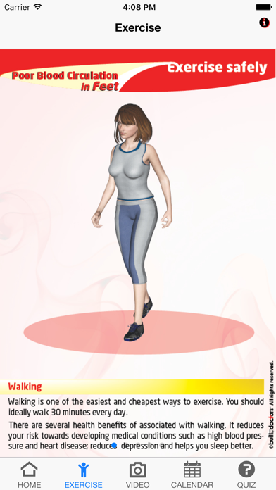 The Exercise Poor Blood Circulation in Feet app teaches the user simple, safe and adequate exercises to deal with Poor Blood Circulation in Feet using interactive tools such as images, videos, calendar with exercise register functionality to keep track on symptoms and exercise frequency and type of activity. The user can then export it to show it to the doctor. Besides, the user can test its knowledge regarding Poor Blood Circulation in Feet in an amusing way through a little and fun quiz. Some information provided may not be valid for residents of other countries due to variations in medical practice and drug approval and indications. This patient education application provides patients and Health Care Practitioners with easy to access information on Poor Blood Circulation in Feet management.