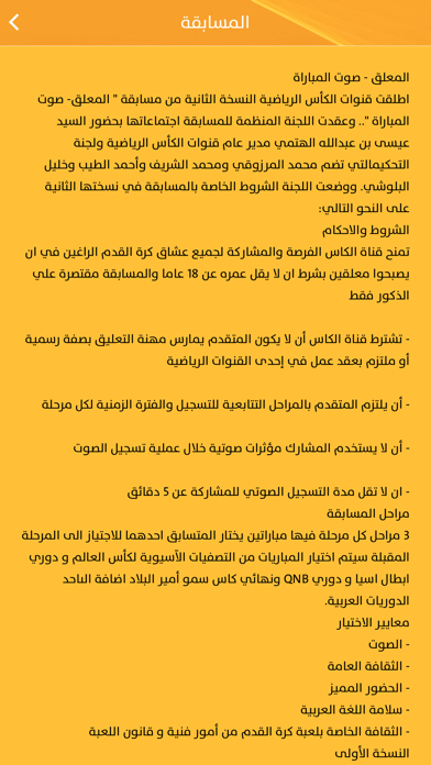 Al Kass Sport Channels open the door for all to expose their talent and be a commentator , This unique concept allow's users to test the skills and knowledge where a special committees will judge the results . Download the app and share your talent . اطلقت قنوات الكأس الرياضية النسخة الثالثة من مسابقة " المعلق- صوت المباراة ".. وعقدت اللجنة المنظمة للمسابقة اجتماعاتها بحضور السيد عيسى بن عبدالله الهتمي مدير عام قنوات الكأس الرياضية ولجنة التحكيم التي تضم محمد المرزوقي ومحمد الشريف وأحمد الطيب وخليل البلوشي. ووضعت اللجنة الشروط الخاصة بالمسابقة في نسختها الثالثة على النحو التالي: الشروط والاحكام تمنح قناة الكاس الفرصة والمشاركة لجميع عشاق كرة القدم الراغين في ان يصبحوا معلقين بشرط ان لا يقل عمره عن 20 عاما والمسابقة مقتصرة علي الذكور فقط - تشترط قناة الكاس أن لا يكون المتقدم يمارس مهنة التعليق بصفة رسمية أو ملتزم بعقد عمل في إحدى القنوات الرياضية - ان لا يكون المشارك قد فاز في المشاركتين السابقتين للمسابقة - أن يلتزم المتقدم بالمراحل التتابعية للتسجيل والفترة الزمنية لكل مرحلة - أن لا يستخدم المشارك مؤثرات صوتية خلال عملية تسجيل الصوت - ان لا تقل مدة التسجيل الصوتي للمشاركة عن ٥ دقائق معايير الاختيار - الصوت - الثقافة العامة - الحضور المميز - سلامة اللغة العربية - الثقافة الخاصة بلعبة كرة القدم من أمور فنية و قانون اللعبة - الحيادية - (Apple) أبل ليس لها صلة و لا تشارك في هذه المسابقة - تجرى هذه المسابقة من قبل قناة الكاس الرياضية.
