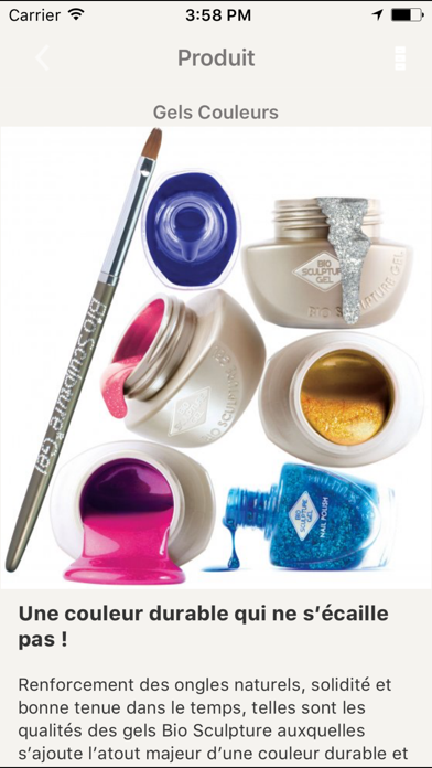 Bio Sculpture France regroupe une gamme de produits de beauté haute qualité pour professionnels. Ces produits peuvent réparer, arranger, corriger et remettre en forme les ongles pendant plusieurs semaines, laissant l'ongle naturel sain et intact. Retrouvez dans l'application tous les produits ainsi que les 150 couleurs de gels et vernis assortis