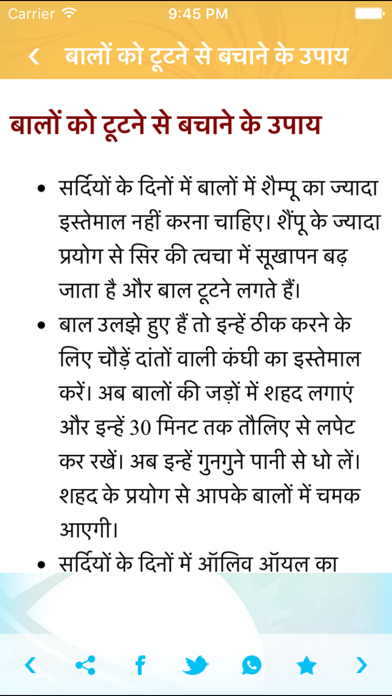 There is nothing more attractive than a thick head of hair that glimmers with natural health. But hair loss is a problem that many people suffer from. There can be several factors behind hair loss such as environmental effects, aging, too much stress, excessive smoking, nutritional deficiencies, hormonal imbalance, genetic factors, scalp infections, use of wrong or chemically enriched hair products, certain medicines and medical conditions like thyroid disorder, autoimmune diseases, polycystic ovary syndrome (PCOS), iron-deficiency anemia, and chronic illnesses. There are about 100,000 strands of hair on your scalp and it is considered very normal to lose 50 to 100 strands a day. But when you start losing more than that, it’s time for you to take some action so it doesn’t progress to baldness or bald spots. Many readily available ingredients can be used to treat hair loss at home. Features:- - Hair care tips to reduce hair fall. - Complete hair fall solution and long hair maintenance tips are provided. - Most of our tips are suggested by top hair care & salon experts. - hair makeup tips to make your hair healthy and shiny. - Dandruff Solutions - Prevent hair fall - Hair fall remedies - Faster hair growth - Foods for hair - Shiny hair - Hair packs