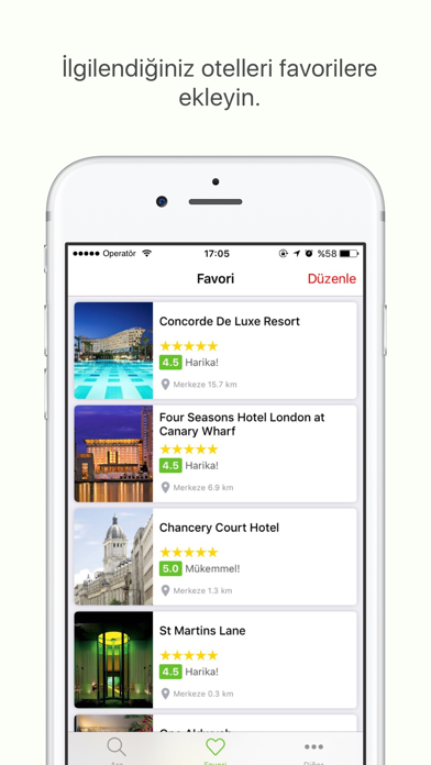 • En uygun oteli bulmak şimdi çok daha kolay ve hızlı! Enuygun Otel uygulaması sayesinde sadece dakikalar içinde tam da aradığınız özelliklere sahip oteli bularak rezervasyonunuzu tamamlayabilirsiniz. • Konaklama tarihlerinizi seçin! Takvim üzerinden giriş ve çıkış tarihlerinizi seçin ve en uygun otel seçeneklerine sadece saniyeler içinde ulaşın. • Kolayca arama yapın! Enuygun Otel uygulaması ile kalmak istediğiniz şehrin veya otelin adını yazarak arama yapabilirsiniz. Ayrıca harita üzerinden konum seçerek, yakınlarda bulunan tüm otelleri listeleyebilirsiniz. • Geçmiş aramalarınızı listeleyin! Daha önce arama yaptığınız şehirleri ve popüler aramalarınızı uygulama üzerinden görüntüleyerek zaman kazanabilirsiniz. • Oda ve misafir sayısına göre arama yapın! Konaklamak için ihtiyacınız olan oda ve misafirlerin sayısına göre arama yapabilirsiniz. Bu sayede farklı odalar için ayrı ayrı arama yapmanıza gerek kalmaz. Yetişkin ve çocuk gibi seçeneklere göre aramanızı daraltarak en uygun fiyatlara çok daha kolay ulaşabilirsiniz. • Seçenekleri sıralayın! Listelenen otelleri fiyata veya ilgiye göre sıralayarak zaman kazanabilirsiniz. Ayrıca her şey dahil, tam pansiyon, yarım pansiyon veya kahvaltı dahil gibi konaklama türüne göre veya otellerin puanlarına göre de sonuçları filtreleyebilirsiniz. Kablosuz internet, yüzme havuzu, minibar ve özel plaj gibi seçeneklerden dilediğinizi seçerek tam da aradığınız özelliklere sahip oteller arasından seçiminizi yapabilirsiniz. • Otel detaylarını inceleyin! Uygulama üzerinden toplam oda sayısı, ücretsiz kablosuz internet, saç kurutma makinesi ve balkon gibi otel detaylarını inceleyebilirsiniz. • Müşteri yorumlarını okuyun! Kalmayı düşündüğünüz otel için rezervasyon işleminizi tamamlamadan önce tesiste konaklayan müşterilerin yorumlarını okuyarak kararınızı verebilirsiniz. • Otel konumunu görüntüleyin! Otel detay sayfalarında ayrıca otelin bulunduğu yeri harita üzerinde görebilirsiniz. Böylece kalacağınız yerin konumunu kolayca inceleyebilirsiniz. • Favorilerinizi kaydedin! Beğendiğiniz otelleri uygulamada bulunan kalp ikonu ile kaydedebilirsiniz. Bu sayede favori otellerinize uygulama ana sayfasından tek bir tuşla kolayca erişebilir ve bir sonraki rezervasyonunuz sırasında zaman kazanabilirsiniz. • Arkadaşlarınızla paylaşın! Otelinizi belirlemek için arkadaşlarınızdan yardım almak isterseniz, otel detaylarını kolayca telefonunuza kaydedebilir veya paylaşabilirsiniz. Uygulamanın sağ üst köşesinde bulunan paylaş ikonu sayesinde otelin detaylarını mesaj veya e-posta olarak gönderebilir veya telefonunuzda saklayabilirsiniz. • İletişime geçin! Otel arama veya rezervayon sırasında herhangi bir sorunla karşılaşırsanız, ''İletişim'' sekmesinden mesaj gönderebilir veya iletişim bilgilerimizi görüntüleyebilirsiniz.