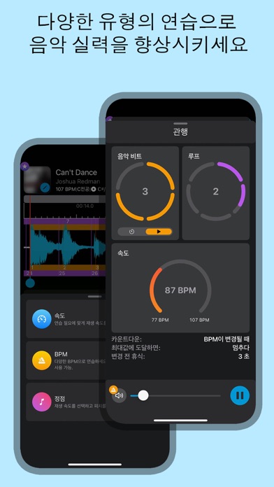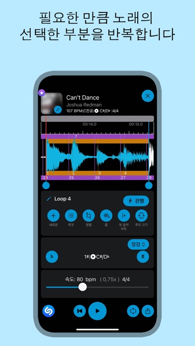 Music Looper로 더 똑똑하게 연습하세요. 음악을 느리게 재생하고 반복하며 파트를 분리할 수 있는 올인원 연습 앱입니다. Apple Music 또는 직접 녹음한 음악을 사용하고, Bluetooth 풋 페달로 핸즈프리 제어도 가능합니다. 주요 기능: • A–B 루프 재생 • 음정을 유지하며 느리게 재생 • 속도, 음정, BPM 자동 변경 • Mixer Ai: 보컬, 드럼, 베이스, 피아노 분리 • Bluetooth 풋 페달 제어 • 메트로놈과 함께 녹음 • Shazam으로 곡 탐지 및 가져오기 • 폴더 및 태그로 곡 정리 • 변경된 속도/음정으로 내보내기 • iCloud로 기기 간 동기화 Apple Music + Shazam 지원: Apple Music 곡으로 연습하세요. 오프라인 녹음 후 Shazam으로 인식 가능합니다. Music Plus 1개월 무료 체험: Apple Music, Mixer Ai, 무제한 루프, 클라우드 동기화 등 모든 기능을 사용해보세요. 추천 대상: • 음악 학생 및 강사 • 보컬, 드럼, 기타, 피아노 연주자 • 댄서와 안무가 • 음악을 효과적으로 연습하고 싶은 모든 사람 Apple Music 사용 시 유효한 구독이 필요합니다. 서비스 약관: https://musiclooper.com/index.php/terms-of-service/ 개인정보 처리방침: https://musiclooper.com/index.php/privacy-policy/